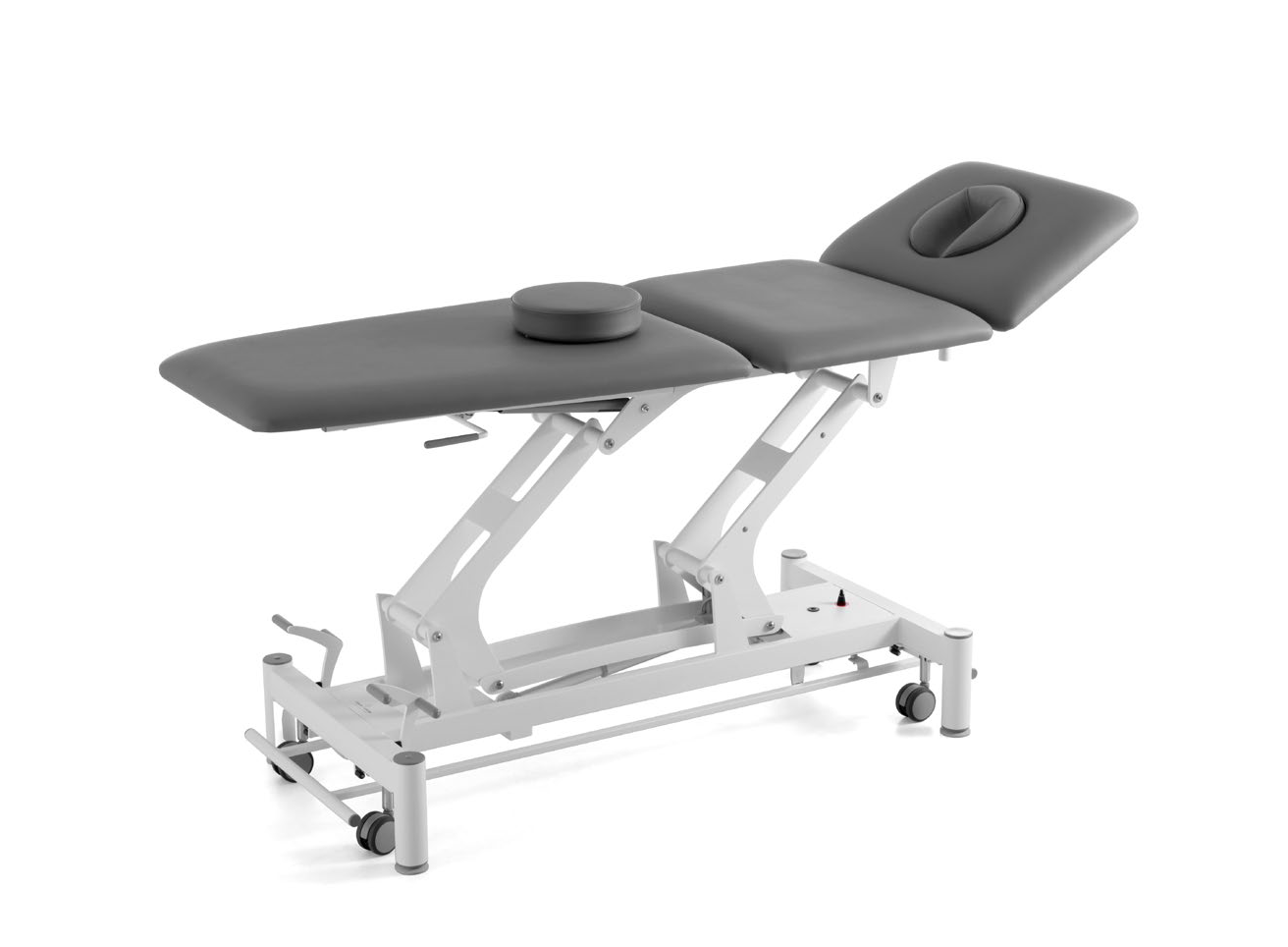 - M-S3.F4: 3-секційний стіл для масажу та лікування з двоважільною висувною системою колеса, що складається з 4 спрямованих коліщаток із центральним гальмом і 4 ніжок із нековзкими гумовими ніжками.